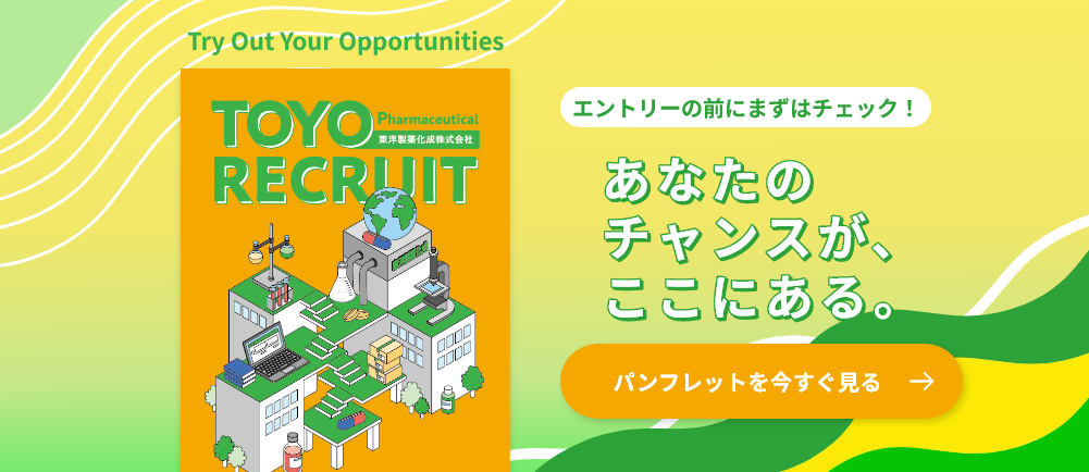 健康を支える医療分野において、 医薬品の果たす役割はますます大きなものになってきています。 「心もからだも輝く健康づくりをめざして」を経営理念に掲げている私たち東洋製薬化成では、 100年の歴史の中で培ってきた技術と経験をもとに、 医薬品の研究開発、製造、受託製造および共同開発に活動のフィールドを広げてきました。 東洋製薬化成は人々の健康な暮らしに貢献する企業としてさらなる飛躍をすべく、 より一層の研究開発を進めるとともに、厳格な製造管理・品質管理体制の構築に努めています。 今、必要な医薬品をより速く、より多くの方々に届けることができるよう、 東洋製薬化成にできる事、 東洋製薬化成にしかできない事をしっかりと見極め、未来に向かって進んで参ります。